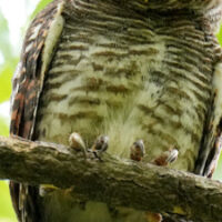 The Jungle Owlet is a relatively uncommon breeding resident, found locally in dense forests, wooded areas, and nearby well-wooded home gardens, ranging from dry lowlands to dry mid-hills. It is typically solitary or seen in pairs and remains active bot...